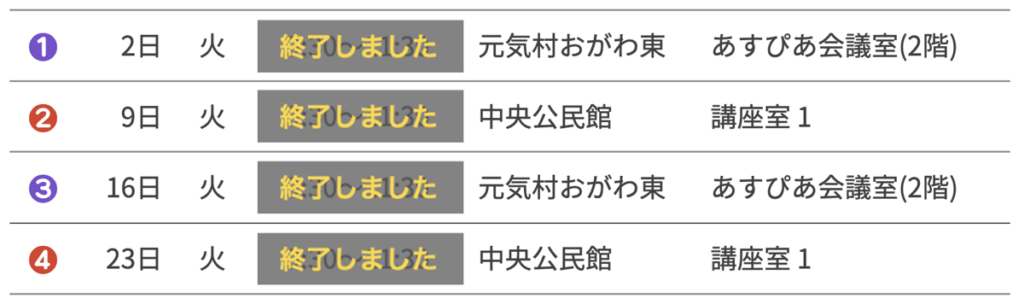 2025年12月 日程と会場 2025.11.012025.12.24開催日程 開催会場 会場への詳しい行き方 事前申し込みは必要ありません。日程・会場を確認いただき、当日会場へ直接お越しください。1月講習会・日程会場はこちら不明な点がありましたら、▶︎ 専用電話 : 080-8576-8895までお問合せください。 ( かけ間違いにお気をつけください )