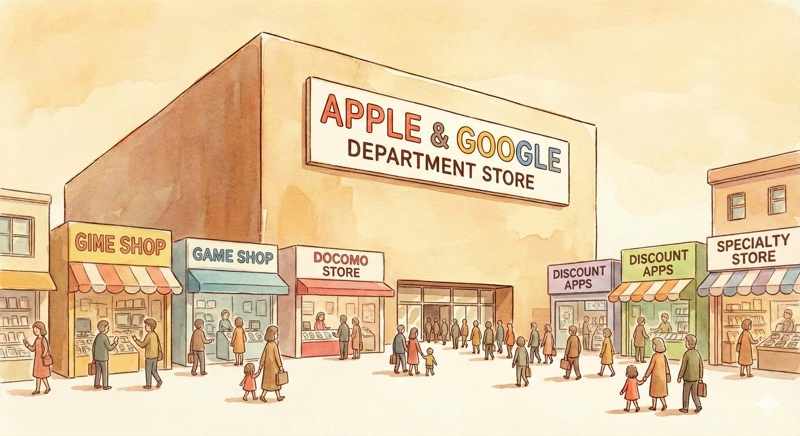 今までは、アプリを入れる場所(App Storeなど)は一つだけでした。これからは、ドコモやソフトバンク、あるいはゲーム会社などが運営する「別のアプリ売り場」からも、アプリを入れられるようになります。